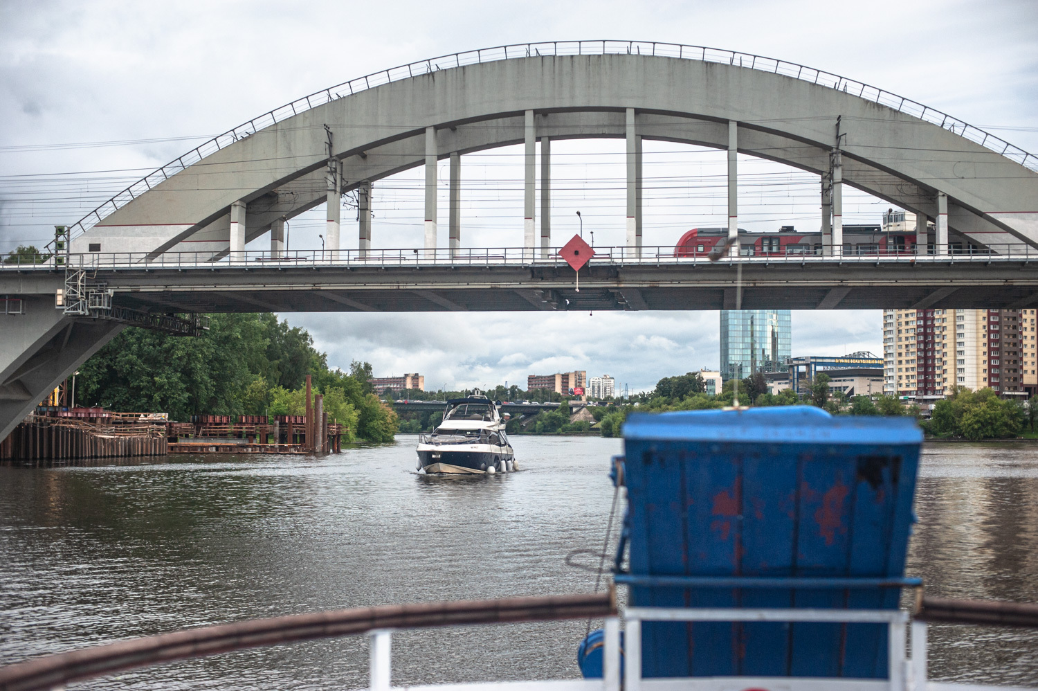 После прохождения грузового порта, Ленинградского моста и мостов МКАД, теплоход совершит оборот у Химкинского железнодорожного моста Октябрьской дороги — этот красивый однопролетный мост является одним из символов подмосковного города Химки.